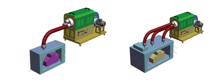 众所周知,型砂干燥效果的好坏,直接影响到铸件的质量。特别是潮湿阴冷天气,砂型烘干合箱后等待浇铸时间一长,型砂也很容易再次吸潮。传统的喷灯烘干方法费时费力,工效低,砂型浇铸面干燥效果不理想,加上干燥深度过浅,致使外部水分渗透至浇铸面过快,加大了铸件质量风险。对结构复杂或多腔室的砂型扣箱后的烘干,传统的整体烘干办法烘干时间长,能耗大,且浇铸面干燥程度很难确认,给铸件质量的把握增加了难度。浇铸流程一般都是砂芯与砂型先烘干→后配箱→再浇铸,工序多,时间长,速度慢,效益低。我公司根据多年工业热风机生产经验,结合铸造行业的实际需要研发的铸型热风干燥机,较好的解决了铸造企业生产中所遇到的这类问题。